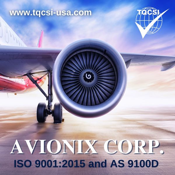 Avionix Corporation, Thank you for choosing TQCSI (USA) for your certification needs! Avionix is certified to ISO 9001:2015 - Quality Management Systems Requirements, and AS 9100 D - QMS Requirements for Aviation, Space and Defense. Since 2009 the organization has been meeting and exceeding its customer requirements and satisfaction, through the continual improvement of its certified QMS. We are proud to welcome Avionix Corporation to the TQCSI (USA) team!