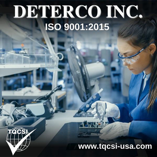 Deterco/Houston Precision Inc. Thank you for choosing TQCSI (USA) for your certification needs! Deterco is certified to ISO 9001:2015 - Quality Management Systems Requirements, and since 2017 the organization has been meeting and exceeding its customer requirements and satisfaction, through the continual improvement of its certified QMS. We are proud to welcome Deterco/Houston Precision Inc. to the TQCSI (USA) team!