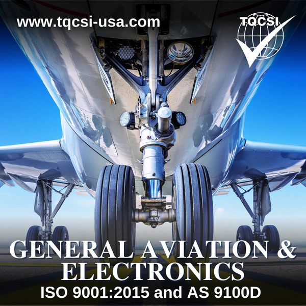 General Aviation & Electronics Mfg. Co., Inc. Thank you for choosing TQCSI (USA) for your certification needs! General Aviation & Electronics is certified to ISO 9001:2015 - Quality Management Systems Requirements, and AS 9100 D - QMS Requirements for Aviation, Space and Defense. Since 2010 the organization has been meeting and exceeding its customer requirements and satisfaction, through the continual improvement of its certified QMS. We are proud to welcome General Aviation & Electronics to the TQCSI (USA) team!