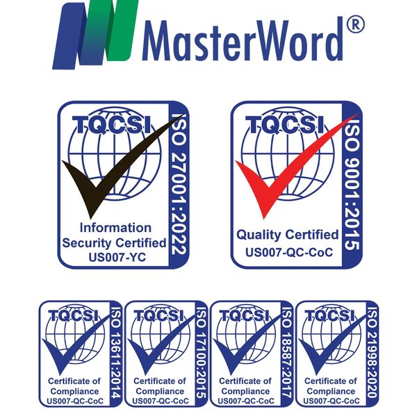 Trusted by clients for their commitment to quality, security, and responsiveness to time-sensitive projects, MasterWord holds several international certifications and has been an outstanding example of ISO 9001 conformance. The company also holds ISO 13611, ISO 17100, ISO 18587, ISO 21998 certifications and has completed the S&P Global / TruSight Best Practices Questionnaire (“BPQ”) Assessment, all with exceptional results. It’s not surprising that on MasterWord’s journey to become one of the first companies globally to achieve the ISO/IEC 27001:2022 certification, the latest edition of the information security international standard, our auditor said of the company’s Information Management System, “It’s one of the best IMSs I've seen.”