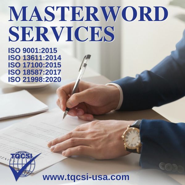 MasterWord Services Inc. Thank you for choosing TQCSI (USA) for your certification needs! MasterWord operates in compliance to ISO 13611:2014 - Interpreting - Guidelines for Community Interpreting, ISO 17100:2015 - Translation Services - Requirements for Translation Services, ISO 18587:2017 - Translation Services - Post - Editing of Machine Translation Output - Requirements, ISO 21998:2020 - Interpreting Services - Healthcare Interpreting - Requirements and Recommendations.